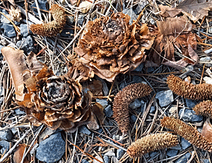 | シダーローズ(ヒマラヤスギの実): マツ科 いつもの場所へ行ってみたら ティッシュの箱山盛りいっぱい拾った 落ちてからしばらくたったせいか拾い上げる時、 パラパラと落ちてしまうので、大きい実は無し 小振りな”モノ”ばかり その形が、 バラの花に似ているので、 『シダーローズ』と名付けられている 毛虫のような形のものは、 「雄花」 |