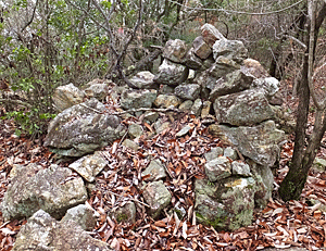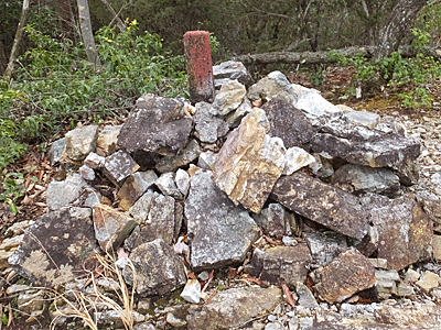 | 林道を歩いて行くと、右側への分岐 以前進んで行ったけれど、途中でプッツン 引き返したことがあるが、 今日は赤布がひらひらして、「おいで・おいで」と誘ってくる 不動の滝方面へ抜けれるようになったのかと 喜んで歩いて行ったが 赤布は、すぐ左折へと誘っている どうやら稜線を歩く道のようだった ↑ ここがピーク 以前来たことはあるが、 その先が分からず引き返したことがある場所 |