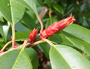 調べ中 面白〜い! つやつやした緑の葉っぱと赤い新芽 何だろう? |