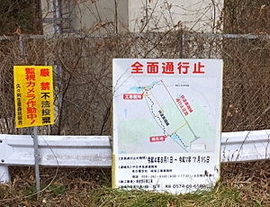 | 「この先全面通行止め」の看板 『この先小渕ため池付近東海環状自動車道 付加車線工事に伴い 奥磯林道を通行止を行い作業させて頂きます』の文字 昨年から約1年間、今年の7月15日までらしい 以前もこんな注意看板があったが 浅間山へ行く場合は、通行可 途中、監視員が立っていて誘導していた 念のため確認→通行OK 8:00〜17:00までが仕事で、立っているとか ずっと立ち通しは大変! |