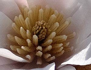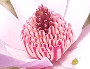 | シデコブシ:モクレン科-3 2019/4/16 植物の会4月例会で観察した画像 参考のため借りてきた(緑の背景の部分) 中央が雌しべ(らせん状になっている) 周りはへら状になっている雄しべ 雄しべが開いてくると花粉が出てくる |