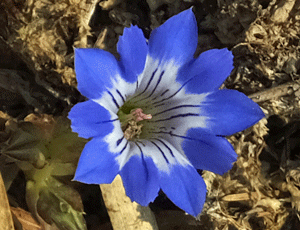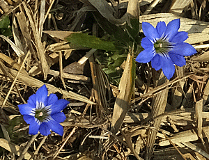| ハルリンドウ:リンドウ科 遊歩道の左右の枯草の中で パラパラ咲き (ここの花は色が濃い) まだ雄しべがくっついているので、咲いたばかり これから雌しべが顔を出してくる 遠すぎていい写真が撮れない・・・ |