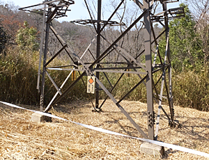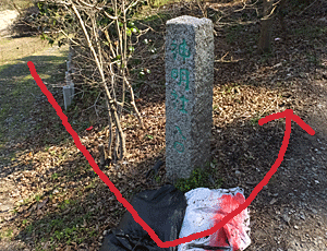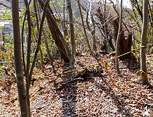 今日は、車道歩きではなく すぐ左手の階段を登って山道へ 左下が民家の並びになっているので こんなロープがあちこちに張ってあって 通行禁止になっていた |
