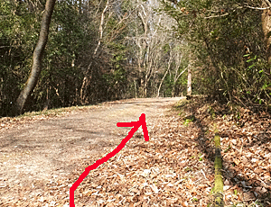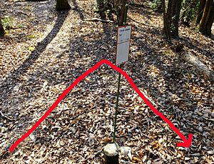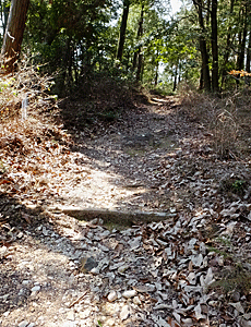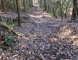 急に、イノシシが掘り起こしたと思われる 凸凹で 靴がうまるほどの落ち葉の道となった |