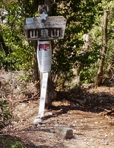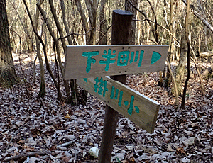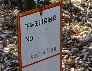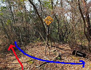 | 山道を進んでいくと、 以前よく使っていた道に合流 10:03 「下半田川自治会」の立て札のあるT字路を右へ |