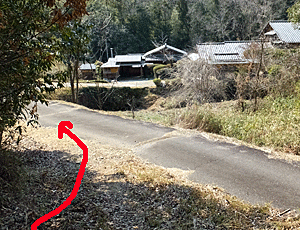 | 下半田川町の最奥まで 14:44 ここから右(赤い矢印)の山道に入り・・・ |