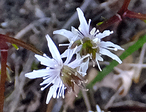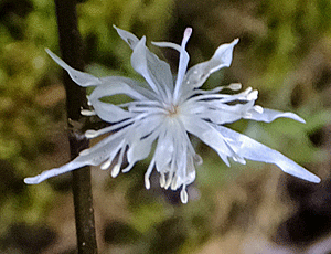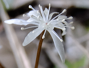 | ショウジョウバカマ:メランチウム科 湿っぽくない尾根道でも咲いていた 麓より、開花時期が早かったようで 雄しべには花粉がいっぱい |