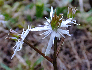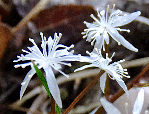 | ショウジョウバカマ:メランチウム科 10株のうち4〜5株は花が咲いていた つぼみ、雌しべが出て、雄しべが出て 白い花粉がついている株など 花の開花状況が様々だった |