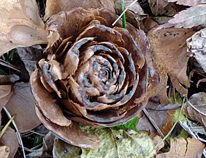 | ヒマラヤスギの実:マツ科 「シダーローズ」という名前 きれいな形だと、ラッカーで固めて 色を付けるとバラの花のようになる (これは拾おうとしたら、パラパラっと落ちててしまったし、 形がちょっといびつ・・・ |