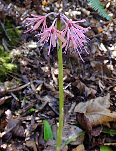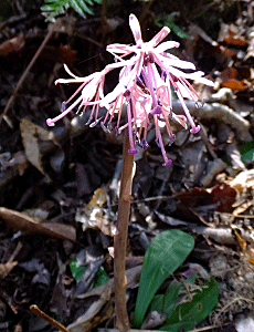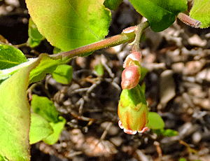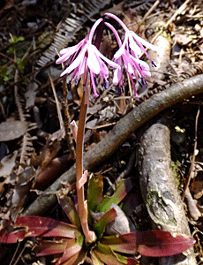 | ショウジョウバカマ:メランチウム科 ついこの前まで、咲いていないかと探し回っていたのに もう、背丈は伸び年を取ってしまっていた・・・ 左:全体像 右:雌しべ・雄しべの拡大 |