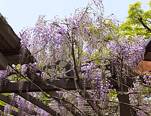 | フジ:マメ科 左 藤色 右 赤っぽい色 五平餅のお店の横、隣同士で咲いていた |