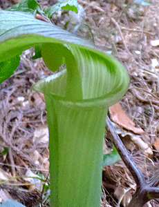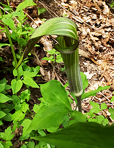 | マムシグサ(テンナンショウ)の仲間:サトイモ科 仏炎苞は緑地に黒っぽい筋 中の棒状のもの(付属体)はつるんとしている |