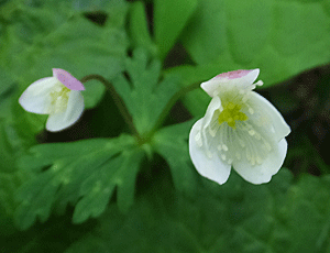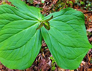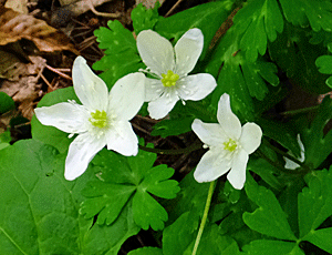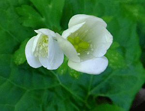 | エンレイソウ:シュロソウ科 左 白い花なので、シロバナエンレイソウ (別名:ミヤマエンレイソウ) 右 紫色の花は、ただのエンレイソウ 紫色の花びらかと思ったら、萼だって |
