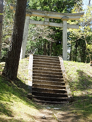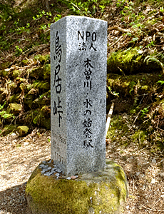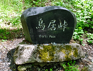 | 林道につき当たって、右折すればすぐ峠の茶屋だが、 峠山方面に少し進むと、左の標識がある ここから左の山へ入っていくと 右の石の標識がある ↑ ここがホントの「鳥居峠」らしい |