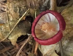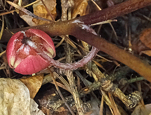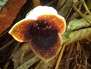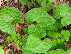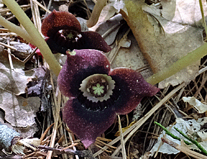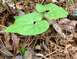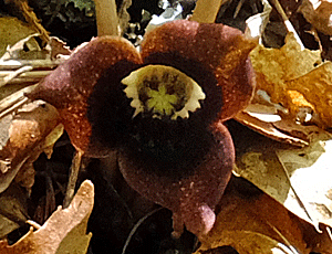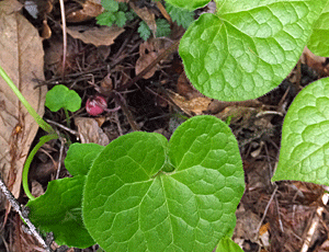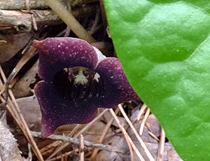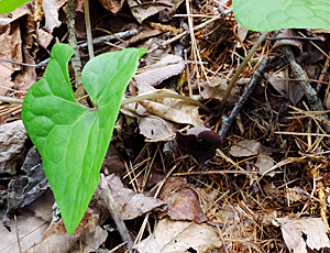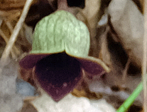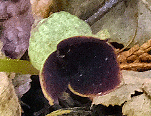 | ウスバサイシン:ウマノスズクサ科 スズカカンアオイの葉より大きく、細長い 大きい花をつける 特定の場所でしか出会ったことがない (2023/5/27 風越山で初めて出会った) |