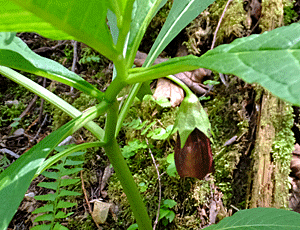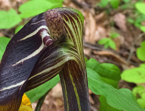 | マムシグサ(テンナンショウ)の仲間 :サトイモ科 全体に黒っぽい 中にある棒状のもの(付属体)も色が濃い |
