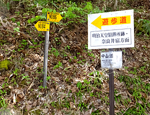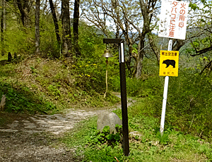 | 林道に出た 標識と熊除けの鐘がある所 右 石造りの「鳥居峠」 が、ここが鳥居峠ではない |