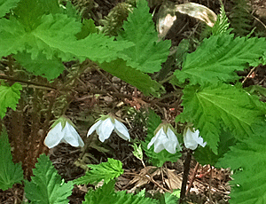 | ナガバモミジイチゴ:バラ科 名前どおり、「長い葉」を持つ 花が上向きではなく 下向きに咲くのも特徴 |
