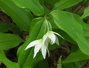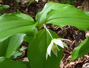| チゴユリ:ユリ科(イヌサフラン科) フツーは、一輪の花をつけるが、 たま〜に二輪の花もある |