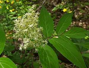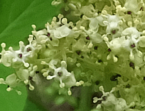 | ニワトコ:ガマズミ科 右 花の拡大 た〜くさんの小さな花をつける 花の真ん中の黒っぽいものは、雌しべらしい |