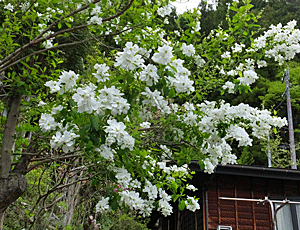 | 薄紫でつるになっているのは、フジの花 横に枝を広げて、 まっ白い花を階段状につけているのは、 たぶんミズキの仲間 いつものことだが、木曽福島駅からは ガイジンさんがたくさん乗り込んでくる |