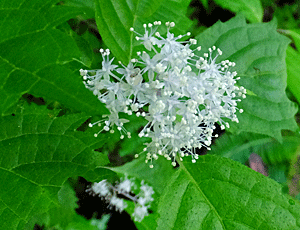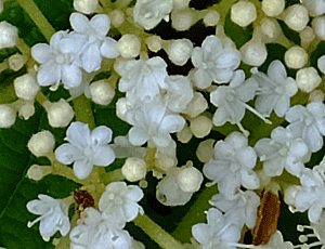 | ガマズミかな?:ガマズミ科 白い小さな花がびっしり 右 花の拡大 |