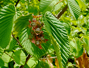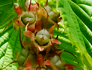 | トサミズキでは?:マンサク科 「ヒュウガミズキ」の名札があったが 実が多いのでトサミズキではないかと思われる 右 実の拡大 |