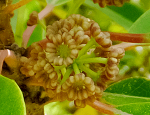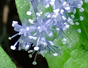 | サルトリイバラ:サルトリイバラ科 たくさんの実がなって、重みで垂れ下がっていた 右は、雌花の様子 (2023/4/2 喜多緑地で撮影) 参考のため借りてきた |