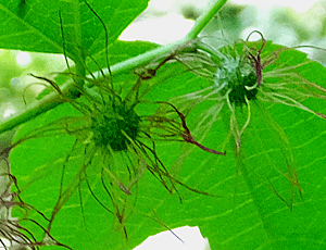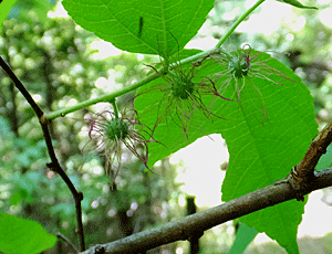 | ヒメコウゾ:クワ科 頭上に、もわもわした長い毛が見えた ↓ この説明を読むと、雄花序のよう 雌花序は見当たらなかった・・・ 『新枝の基部の葉腋に雄花序、 上部の葉腋に雌花序をつける 雄花序は長さ約1cmの柄があり、 直径約1cmの球形 雌花序は柄が短く、直径約5mmの球形』だって |