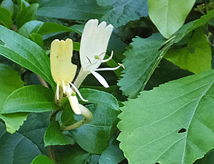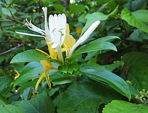 | スイカズラ(金銀草):スイカズラ科 白色と黄色が同居しているので、金銀草の別名がある 初めは、白色 黄色になると枯れていく 甘い香りがする 蜜も甘い |