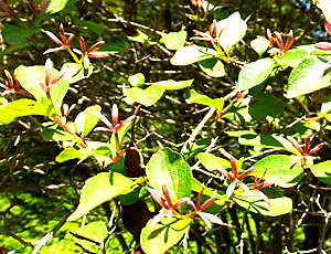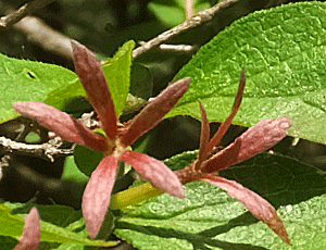 | ツクバネウツギ:スイカズラ科 5枚の萼が特徴だが、こんなに赤いのは数少ない 花はどれも白かったが・・・ |