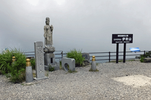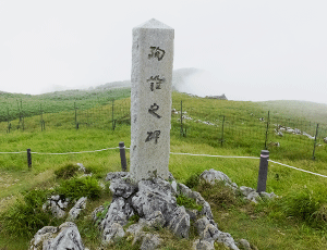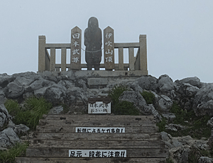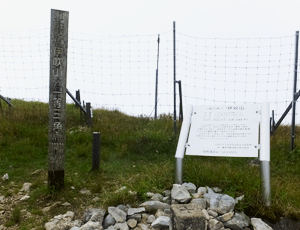 | 三角点から東コースへ進むと、 「殉難之碑」がある 『1931年、測候所の職員が勤務交代のために登山中、 3合目で猛吹雪に遭って遭難。 1934年、山頂付近の 雪庇(せっぴ)が崩落して引き起こした 雪崩に巻き込ま亡くなった。 測候所跡に、 この2人の職員の「殉難之碑が建てられた・・・』と |