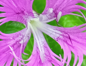 | カワラナデシコ:ナデシコ科-2 花の拡大 『雌しべは2本、雄しべは10本』 雄しべ先熟の花』だって ・・・・・・・・・・・・ 左 葯のある雄しべらしいものが見える 右 くるっと先端が曲がった「モノ」が、雌しべらしい |