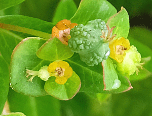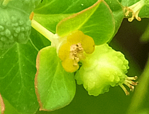 | タカトウダイの仲間:トウダイグサ科 黄色〜橙色の花のように見える部分は「腺体」 ↑ このような楕円形の形は、「タカトウダイ」 「腺体」が三日月形だと、「ナツトウダイ」 丸くてイボイボのある丸いものは、「子房」 面白く複雑なつくりなので、私のお気に入り |
