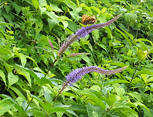 | クガイソウ:オオバコ科 葉っぱの付き方は輪生(右) そっくりさんに、「ルリトラノオ」があるが、 葉は対生なので区別は簡単 |