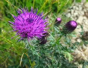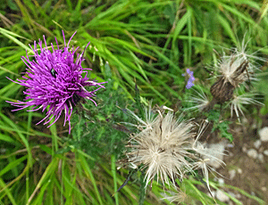 | ミヤマコアザミかな?:キク科 そっくりさんに、「コイブキアザミ」がある ・・・・・・・・・ 「コイブキアザミ」は、伊吹山固有種 ミヤマコアザミ==山地のあちこちに分布 違いは? 『葉の切れ込みが浅く花が紫色で 茎の頂に頭花が円錐形に密集して咲くならコイブキアザミ 葉の切れ込みが浅くなく、花が紅色ならミヤマコアザミ』だって *葉の切れ込み? 何をもって浅いかそうでないかを決めるの? *紅色と紫色? 似たような色だもの、決定的な違いとは言えないなあ・・・ *また、『伊吹山にはこの2種類の他に 「イブキアザミ」もある』・・・と 『花は8月下旬〜9月に咲き、 山頂より中腹の方が多い』・・・と ・・・・・・・・・・ で、結局この↑アザミは「何アザミ」と言っていいんだろう?? ・・・・・・・・・ 「伊吹山週間花情報(2025/7/24更新版)」には、ミヤマコアザミとなっていた |