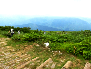 | が、さっきまでのガスは何処へ行った? ピ−カンの青空・サラシナショウマはまだつぼみ・・・ 木陰もない階段登りはもうイヤダ! 途中から下ることにした 13:20 もう少しその決心が早かったら、 13:30のバスに間に合ったのだが、 「いいや、ビールでも飲んで待っていれば・・・」と思っていたが、 ビールの気分ではなかったので、 バスの待ち時間が長かったこと! |