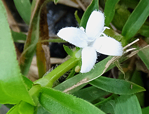| オオフタバムグラ:アカネ科 今までに出会ったことがあるのに、名前が思い出せない・・・ 背丈2〜3cmほど 横へ広がって咲く 花びらにも葉っぱ・茎にもふわふわの毛がある どこで出会ったかを思い出すと、 「竜吟湖」の端・・・ 私のHPの記録を探すと あった〜! オオフタバムグラ 「オオフタバムグラ」のそっくりさんの花に 「フタバムグラ」がある 違いは、『花に柄があるかないか』だって 『オオフタバムグラの花は柄がなく 葉腋(葉と茎の間の部分)に直接付く フタバムグラの花には短い柄がある』だって で、じっくり葉っぱの付き方を見てみると、「柄は無し」 ===オオフタバムグラという分け |