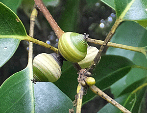 | ドングリの仲間:ブナ科 殻斗(かくと)の模様が横縞で、ぺちゃんこ そんなドングリには、 『アカガシ、シラカシ、アラカシ、 ウラジロガシ』などが あるそうだが、私には、同定は無理・・・ |