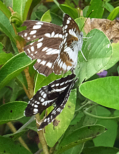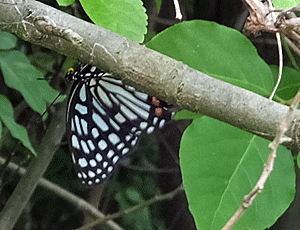 | これもマダラチョウの仲間かな? 飛んでいる時は、お尻の方の羽根が 赤くちらりと見えたが、葉っぱなどにとまると 見えなくなってしまった じっととまっていることはなく、あちこちへ ひらひらととび回っていた 花もない所で・・・ ?? |