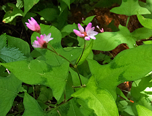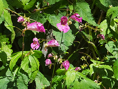 | ツリフネソウ:ツリフネソウ科 本当に「船が吊り下っている」ような花の形 水が好きな花で群生していた |