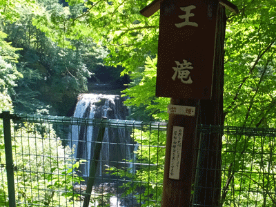 | 「王滝展望台」 13:05〜13:30 やっと座れるベンチがあった(ここで昼食タイム) 目の前には、立派な大きな滝が見えるが 対岸であることと、目の前のフェンスがあるので イマイチ「乙女の滝」に比べて迫力がない でも、ここにフェンスがないと、「転落の危険大」の場所 |
